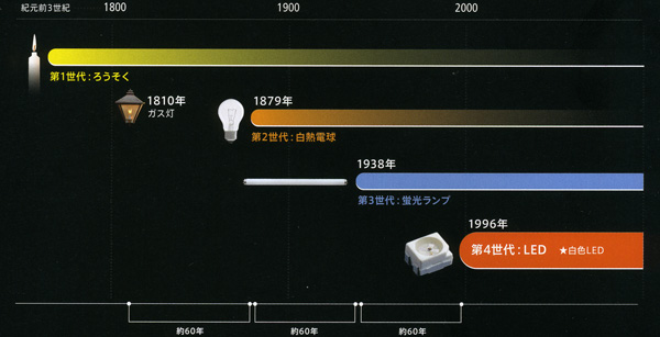 ガス灯~白熱灯(白熱電球 1979年エジソンが発明)~蛍光灯、そして白色LEDの誕生。あかりは、約60年ごとに大きな発明があります。LEDは約10年前に白色光が実用化かれ、今後の主要な照明光源として期待が高まっています。